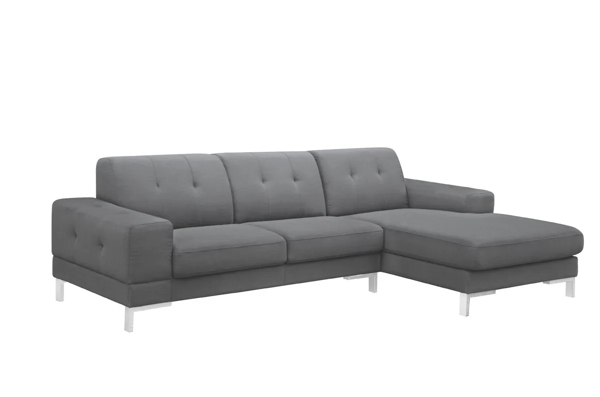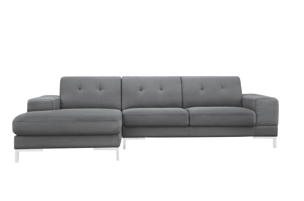 Make way for the classy Divani Casa Willa Modern Grey Fabric Sectional Sofa and let your living space have that alluring ambiance. Tufted with buttons, this grey polyester fabric upholstered sectional sofa was constructed with a left facing chaise that completes its L-shape structure. Its modular design allows you to create two pieces separately. With its polished rectangular brass legs, this modern sectional sofa makes a great show stopper in any home