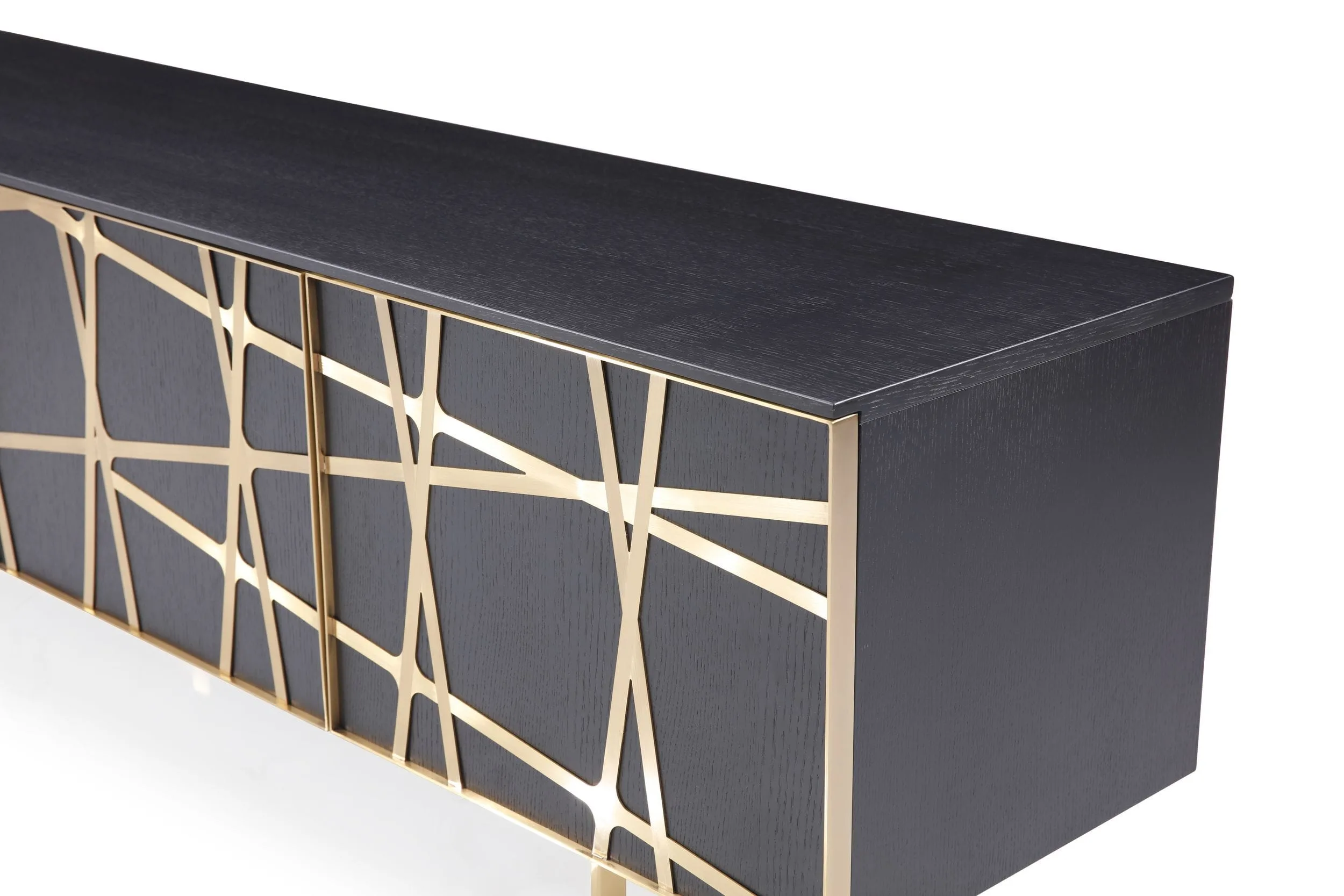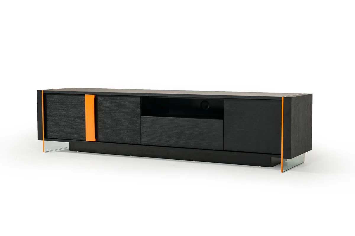The Modrest Cirque Modern Black Ash TV Stand! This sleek and contemporary piece features circular ring design door fronts that add a touch of elegance. The black ash veneer finish exudes sophistication, while the matte finish ensures a smooth and refined look. Supported by sturdy iron legs, this TV stand boasts four doors for ample storage space. Plus, it accommodates a maximum TV screen size of 86 inches. Minimal assembly is required, making it a convenient addition to your home entertainment setup.
