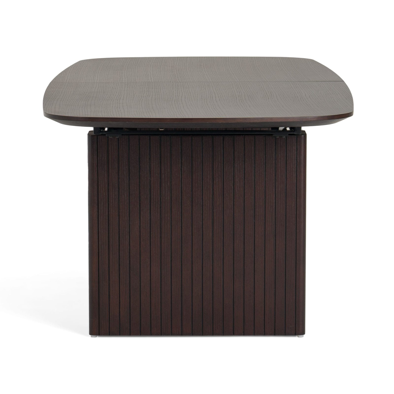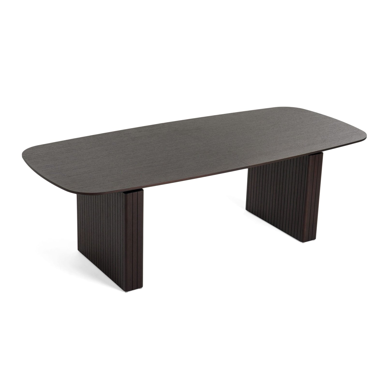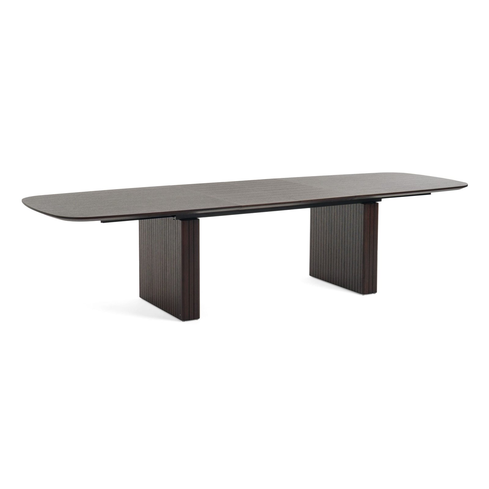 The Calhoun Extendable Dining Table is the perfect modern dining table for a modern home. The slatted, smoked oak veneer, pedestal legs of this gorgeous table create a dramatic silhouette for this table. The table seats up to 8 and 12 when it is fully entended with two of the extensions.