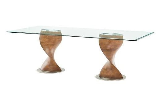Statement Contemporary Dining Table with twisted solid wood double pedestal base in Walnut finish and temprered Glass table top.