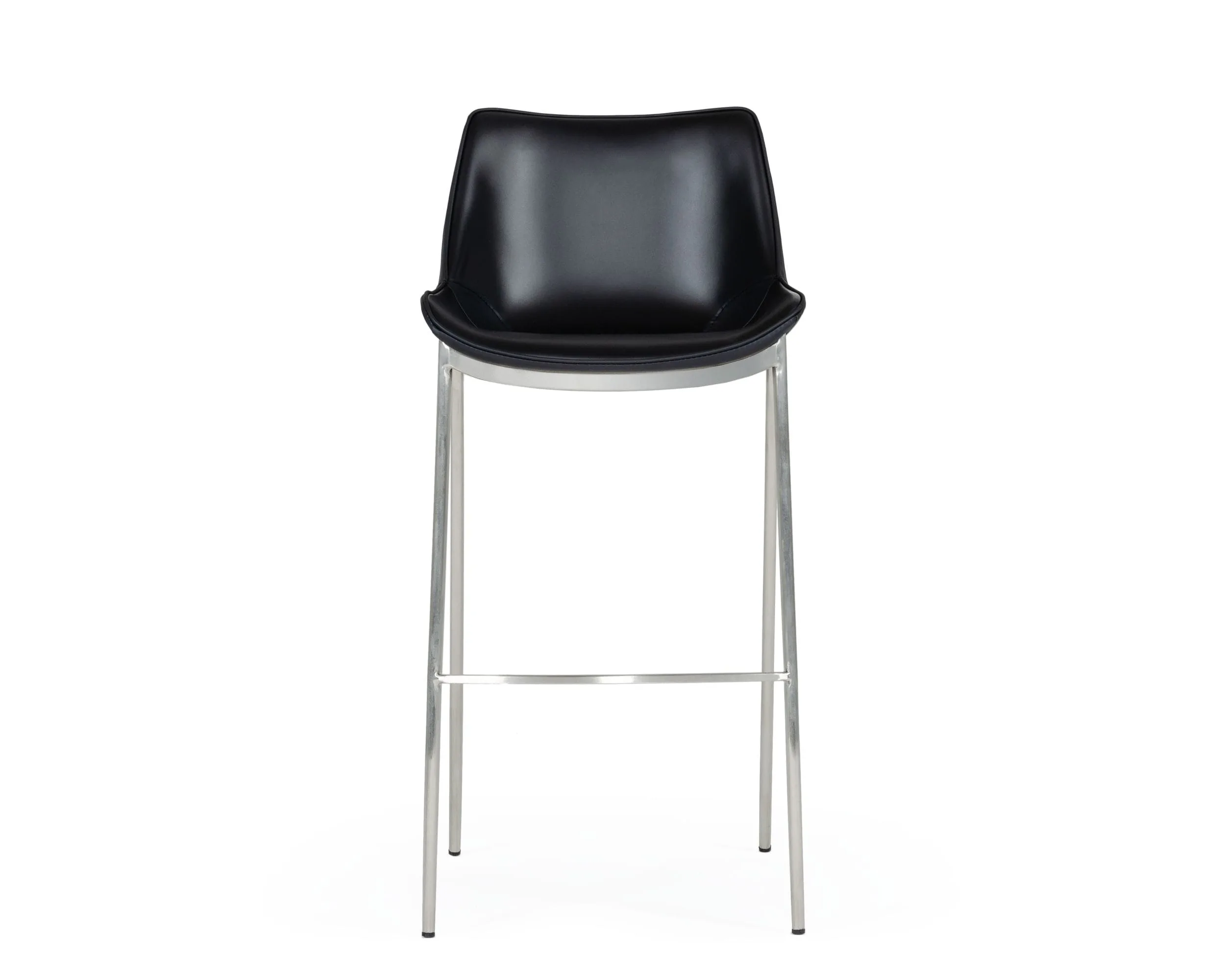 This stunning modern bar stool is sure to turn heads. The dark brushed stainless-steel legs against the light orange vegan leather creates visual interest and texture contrast. The saddle style seat is supportive while reminiscent of a mid-century silhouette. An industrial flare makes this an extremely versatile piece.