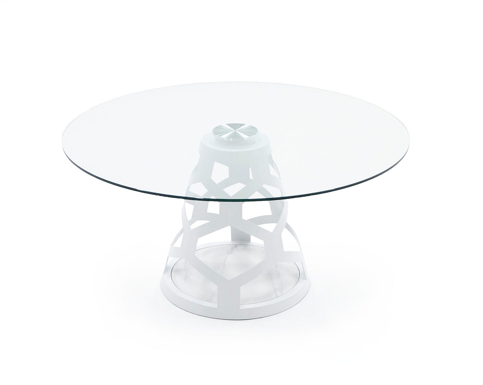 The Modrest Lilly Modern White and Glass Round Dining Table is a sophisticated and elegant addition to any contemporary dining space. This exquisite table features a round tempered glass top that provides a sleek and modern aesthetic, allowing you to showcase the beauty of your dining room decor. The white high gloss base adds a touch of luxury and complements the overall design flawlessly. With its sturdy construction, this dining table is built to last, ensuring long-lasting durability. The round shape encourages social interaction and creates an intimate dining experience. Whether hosting dinner parties or enjoying family meals, this table offers ample space to comfortably accommodate four to six people. The Modrest Lilly Dining Table seamlessly combines style, functionality, and quality craftsmanship, making it a standout piece that will elevate any dining area.