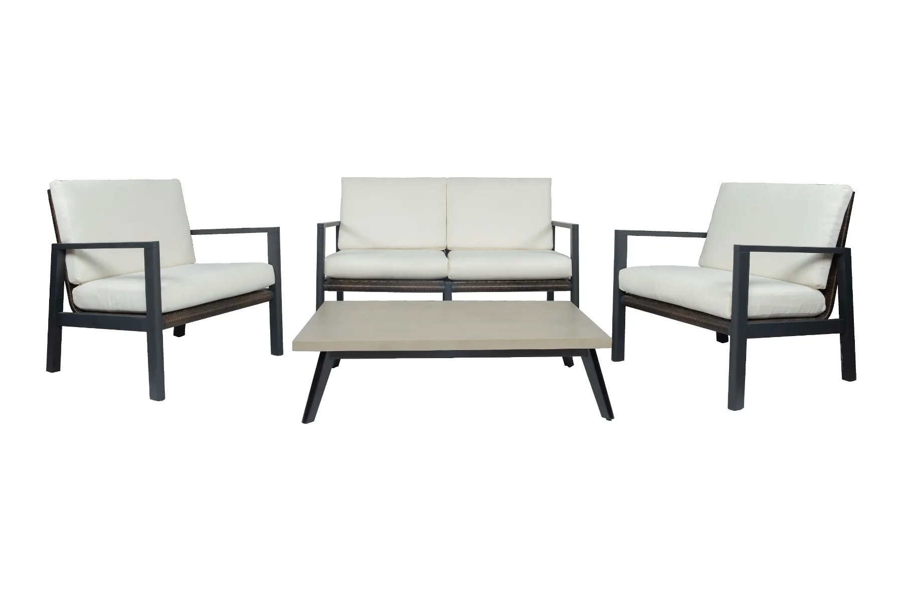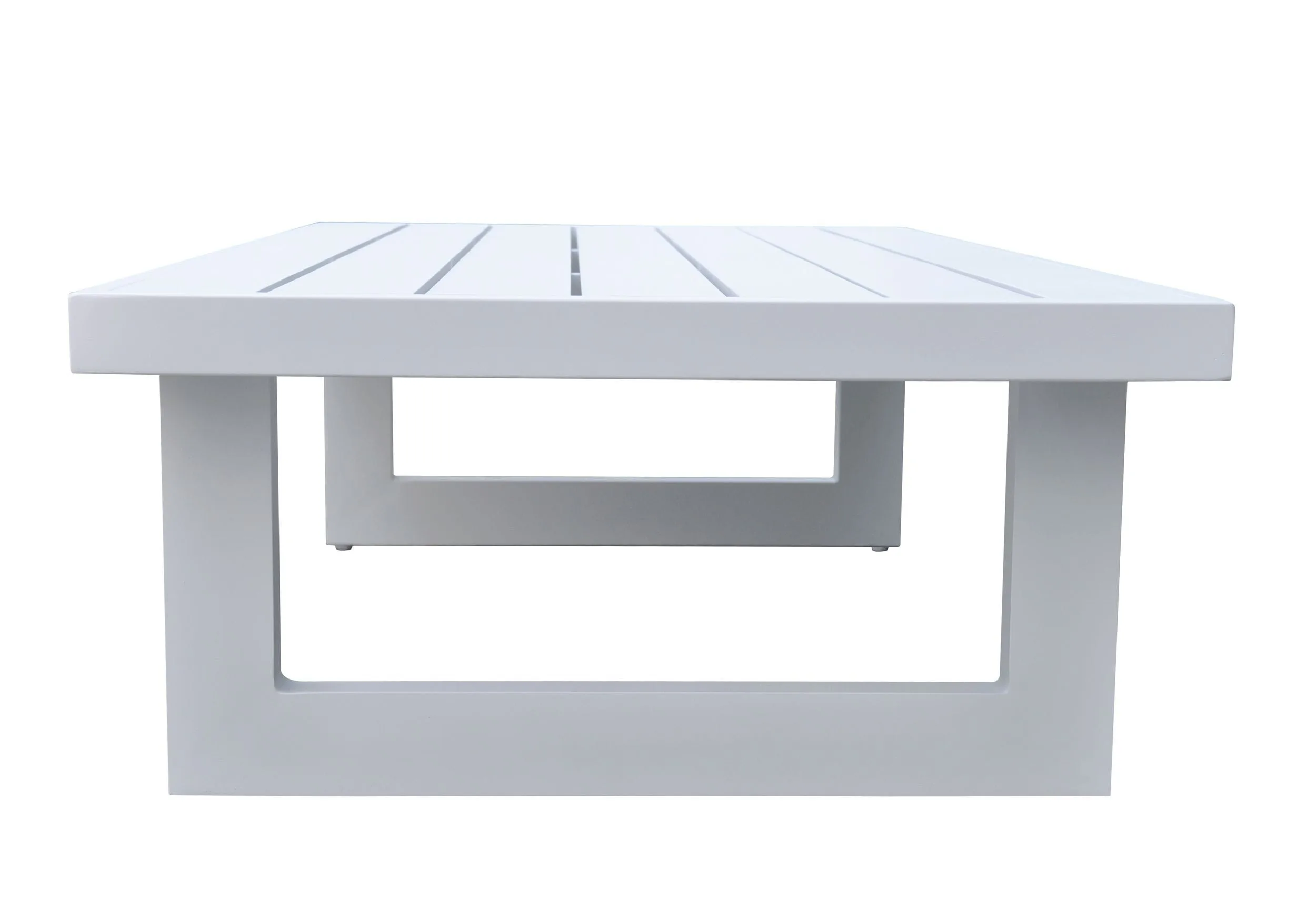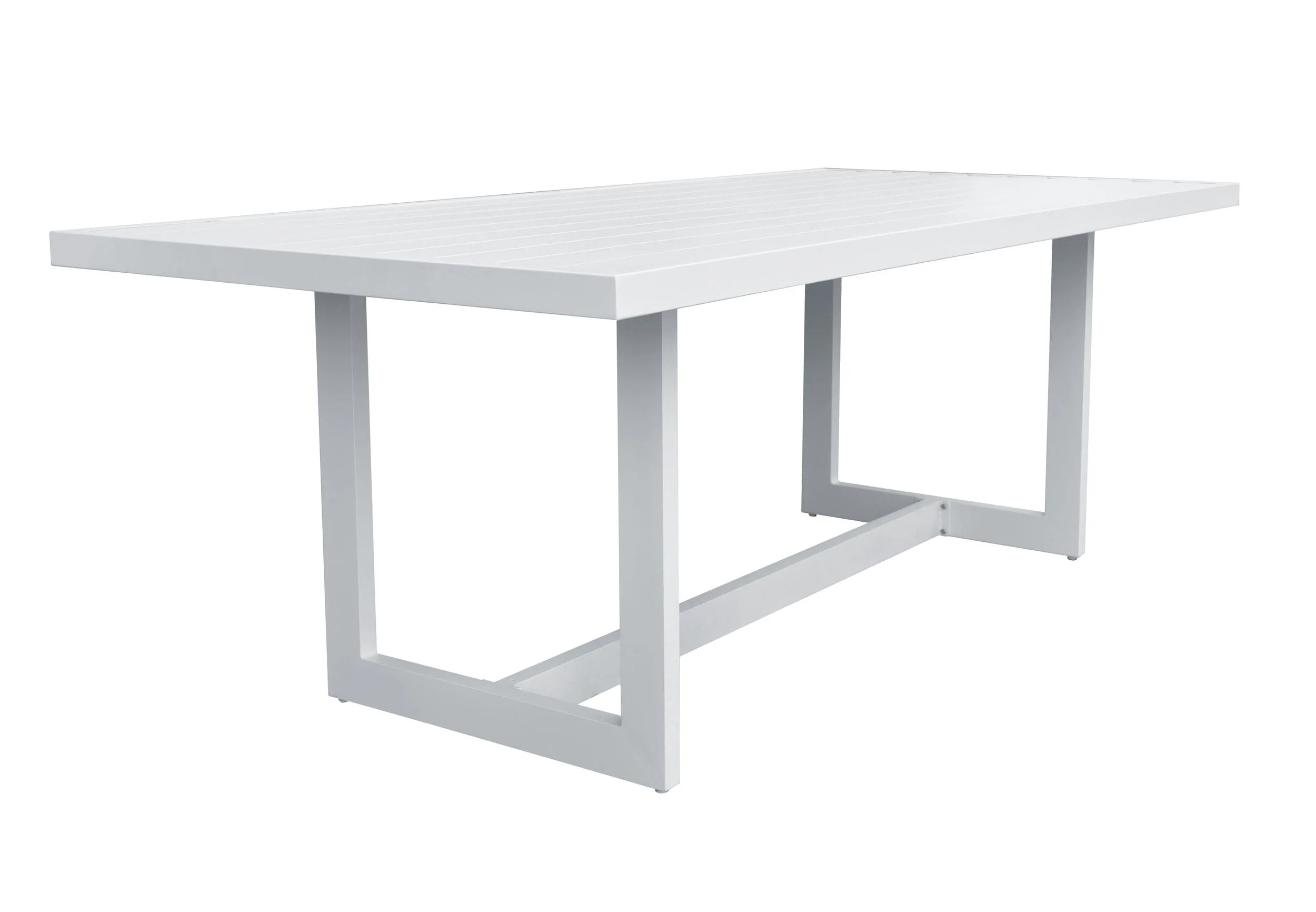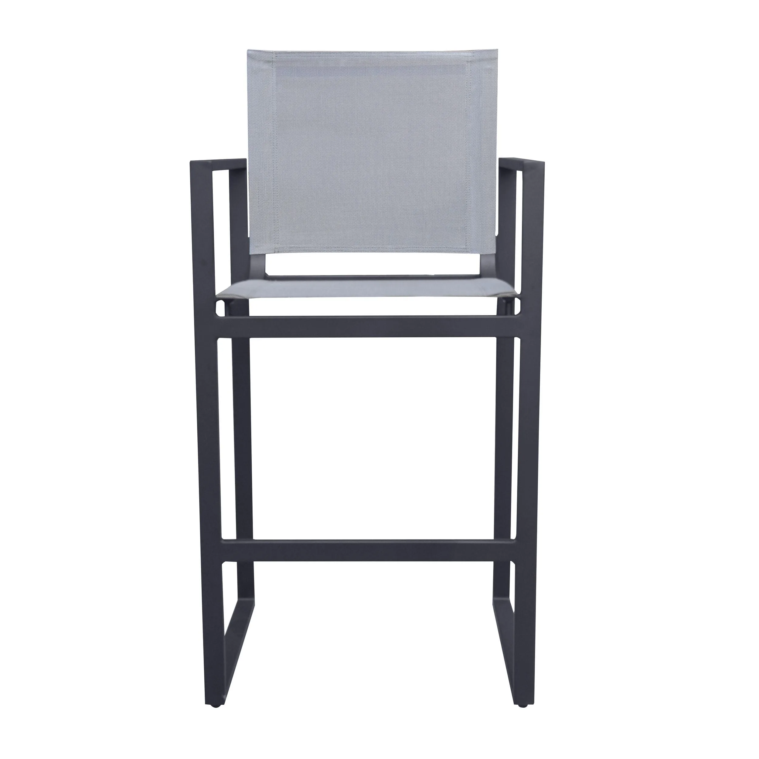 The Marina Outdoor Dining Set is great for a spacious area in the back yard to relax on the weekends with friends or family. This table has a leaf that extends out to fit the eight dining chairs that come with this set. This set is grey plywood with black powder-coated aluminum frames.